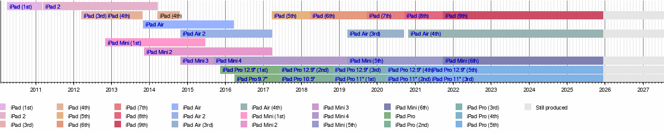 - אייפד מיני – באוקטובר 2012 הוכרזה גרסה מוקטנת למכשירי האייפד. גרסה זו כוללת מעבד A5 של אפל, מסך בגודל 7.9 אינץ', חיבור הברק, וזוג מצלמות קדמית ואחורית בדומה למצלמות אייפד 3