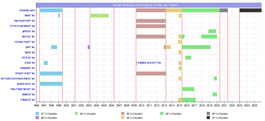 כראש ממשלה בסוף שנות התשעים חתם על הסכם חברון והסכם וואי עם הרשות הפלסטינית. כשר אוצר, בין השנים 2003–2005, הוביל נתניהו רפורמות בכלכלה הישראלית ובין היתר קידם הפרטה, הורדת מיסים וקיצוץ בקצבאות הביטוח הלאומי. במהלך כהונתו הרביעית כראש ממשלה, בשנת 2018, הועברה השגרירות האמריקאית לירושלים ובכהונתו החמישית, בספטמבר 2020, נחתמו הסכמי אברהם. כהונה זו התארכה בעקבות המשבר הפוליטי בישראל. במהלך כהונותיו אירעו מבצע עמוד ענן, מבצע צוק איתן, מבצע שומר החומות ומתקפת הפתע של חמאס, שכללה מעשי טבח המוניים והובילה לפרוץ מלחמת חרבות ברזל. אירועים בולטים נוספים במהלך כהונתו כללו את גלי ההסתננות מאפריקה לישראל בין 2005 ל-2013 ובניית מכשול המעבר בגבול ישראל-מצרים, המחאה החברתית ועסקת שליט בשנת 2011, התפרצות מגפת הקורונה בישראל בשנת 2020, קידום "הרפורמה המשפטית" בשנת 2023 ומחאת השמאל הנרחבת בעקבותיה.